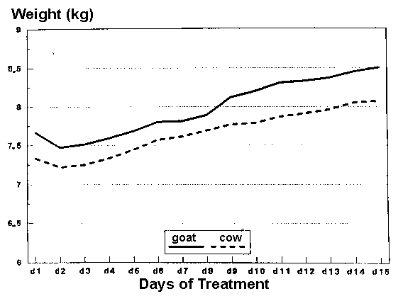 Figure 1. Development of bodyweight of 30 malnourished children (age 1 to 5 years) fed either goat milk (n = 15) or cows milk (n = 15) (Razafindrakoto et al., 1993). GM-10 |