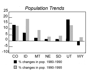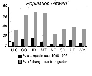 From 1990-1995, the Mountain States exceeded the national rate of growth and grew much faster as a group than did the Plains States. Migration accounted for about two thirds of that increase in the three fastest growing states.